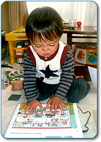 愛知県春日井市 『子どもに教えられることがいっぱい!』 ほとんどの教具は、親が出して使う準備をしているのですが、かるたカードは、自分から出してきて「一緒に見よう!」と言います。かるたカードを使って、物の名前を教えていますが、どうやらそれが気に入ったようです。一人でもペラペラめくり、絵本のようにじっくりながめ、知っている動物などが出てくると「これは、きりんだね〜!」など、嬉しそうに言っています。 |
