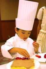 「できるだけお母さんは手を出さずにサポート役に徹してくださいね。」上手に作ることより楽しく作ることを大切にしたいと、子どもたちにもわかりやすい説明とサポートでパティシエは授業を進行します。「赤、緑、黄色、いろんな色のフルーツがあります。どの色をどのようにトッピングすると美味しそうに見えるか、おじいちゃんやおばあちゃんの笑顔を思い浮かべながらトッピングをしましょう!」アドバイスをもらう子どもたちも真剣そのもの。約90分の授業はあっという間に終了してしまいました。