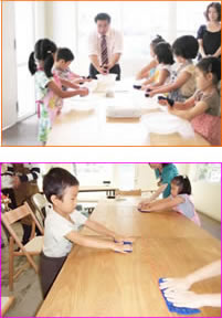 テーマは「おもてなし」。 子どもたちが、先生のお手本を見ながらお茶とお菓子を準備し、お父さん・お母さんをおもてなしします。 普段大人がしていることに子どもが挑戦することで、自信の芽を育んでもらえればと企画しました。